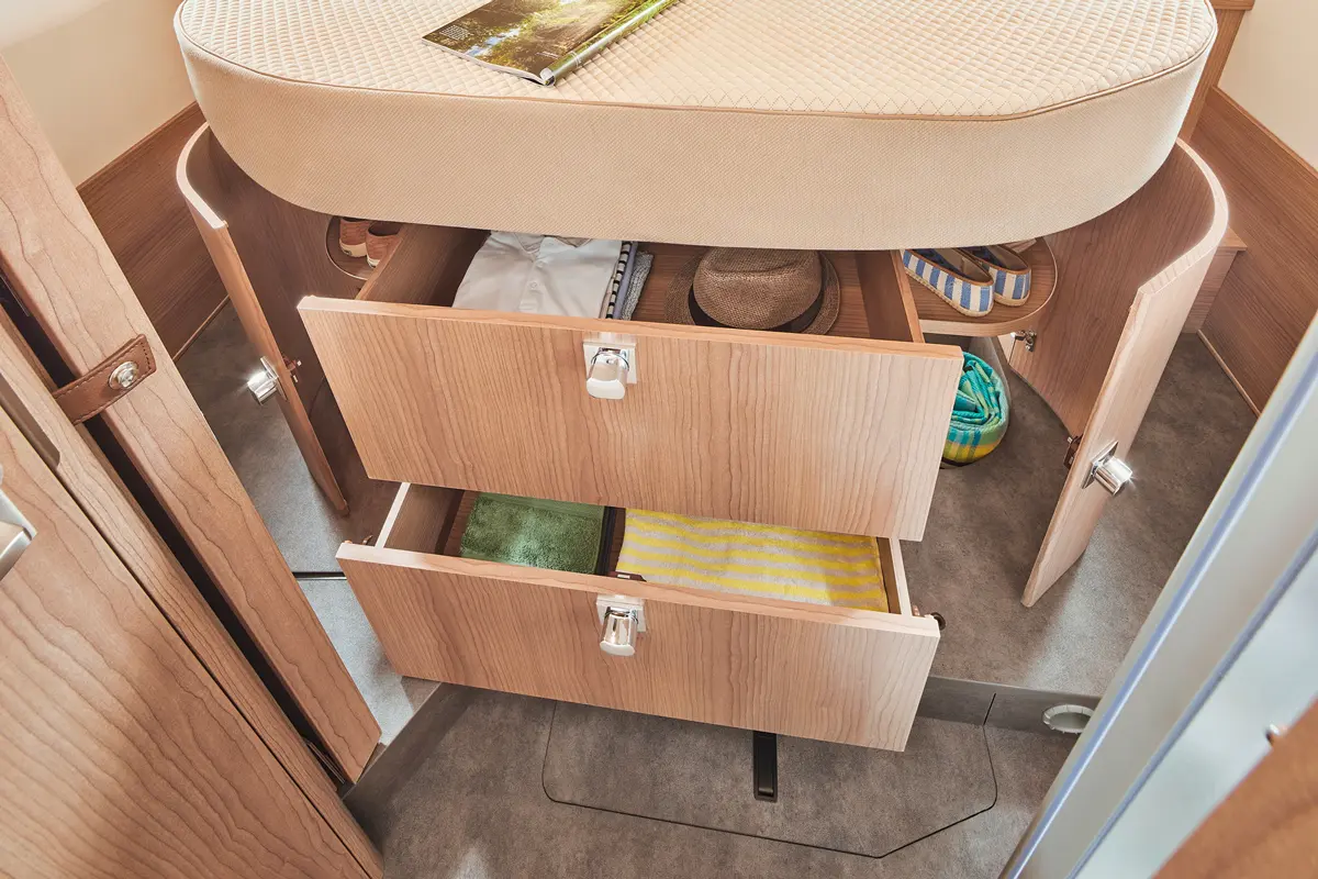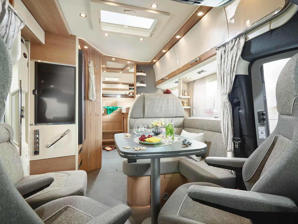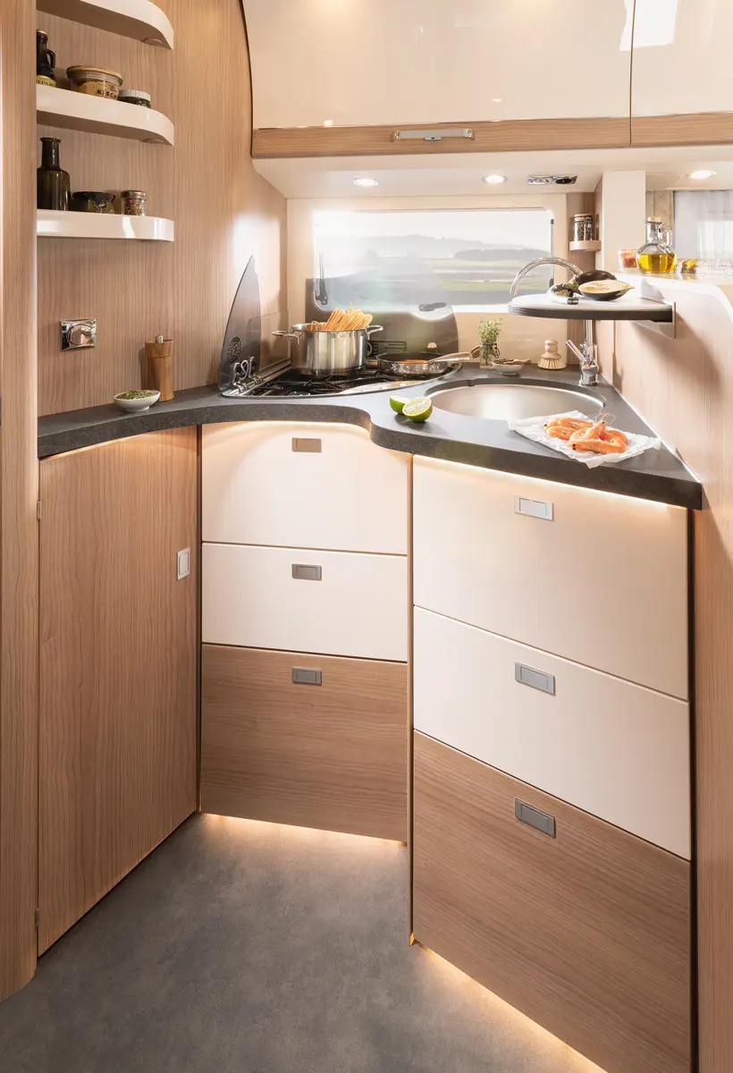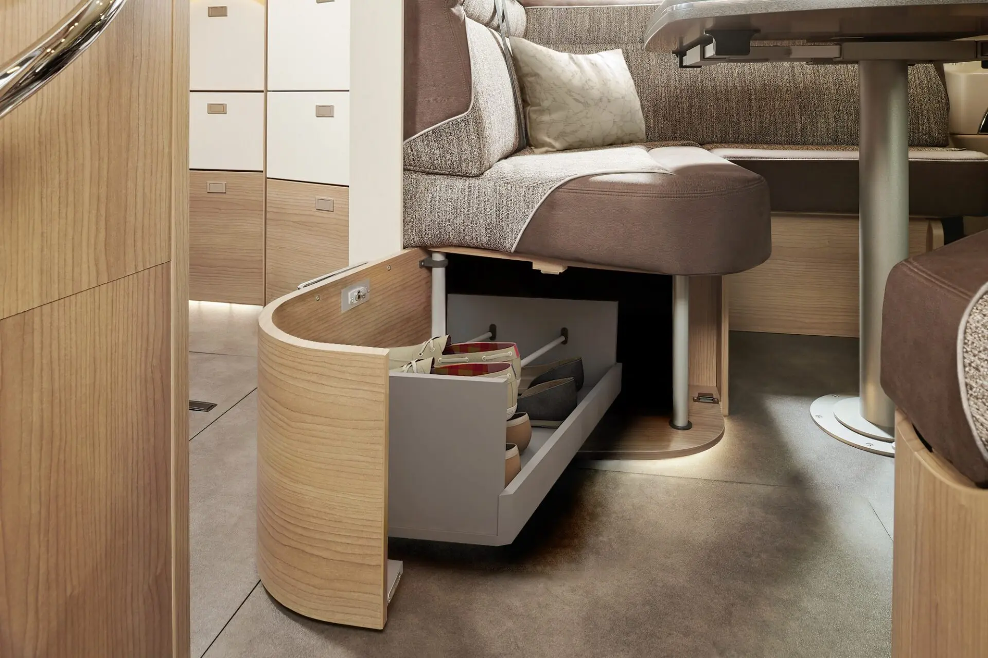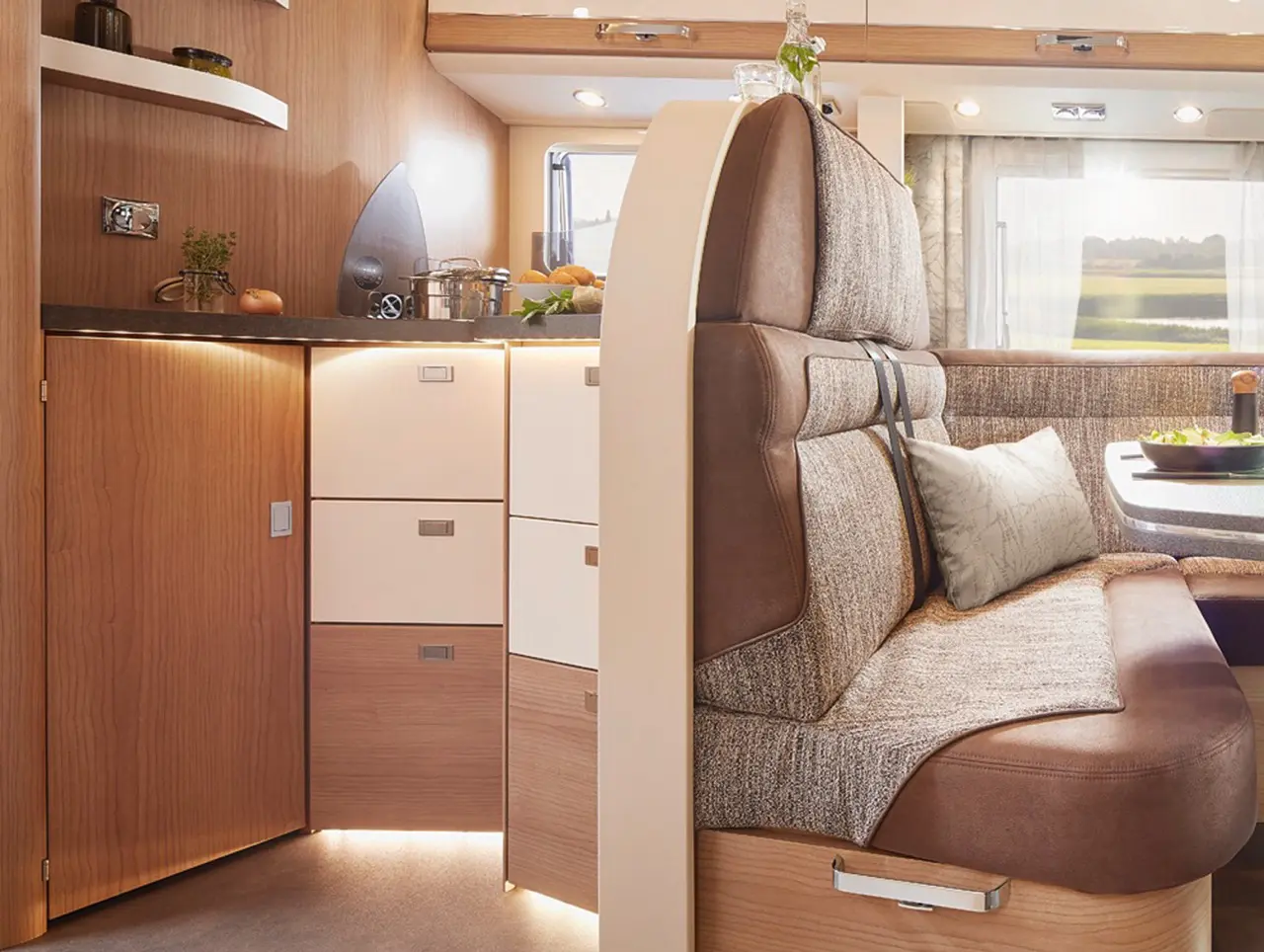Wohlfühlen wie zuhause: Die L-Wohnsitzgruppe mit ausdrehbarem Schuhschrank und breiter auschwenkbarer Seitensitzbank, die Komfort-Winkelküche, das Komfort-Raumbad mit vollkommen separierbarem Umkleidezimmer und Längseinzelbetten mit großer Liegelänge machen es möglich.