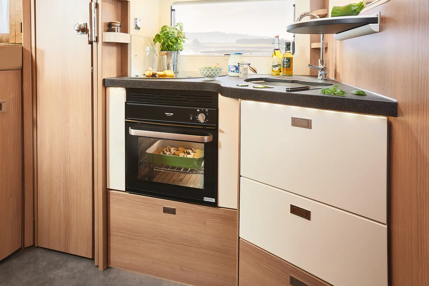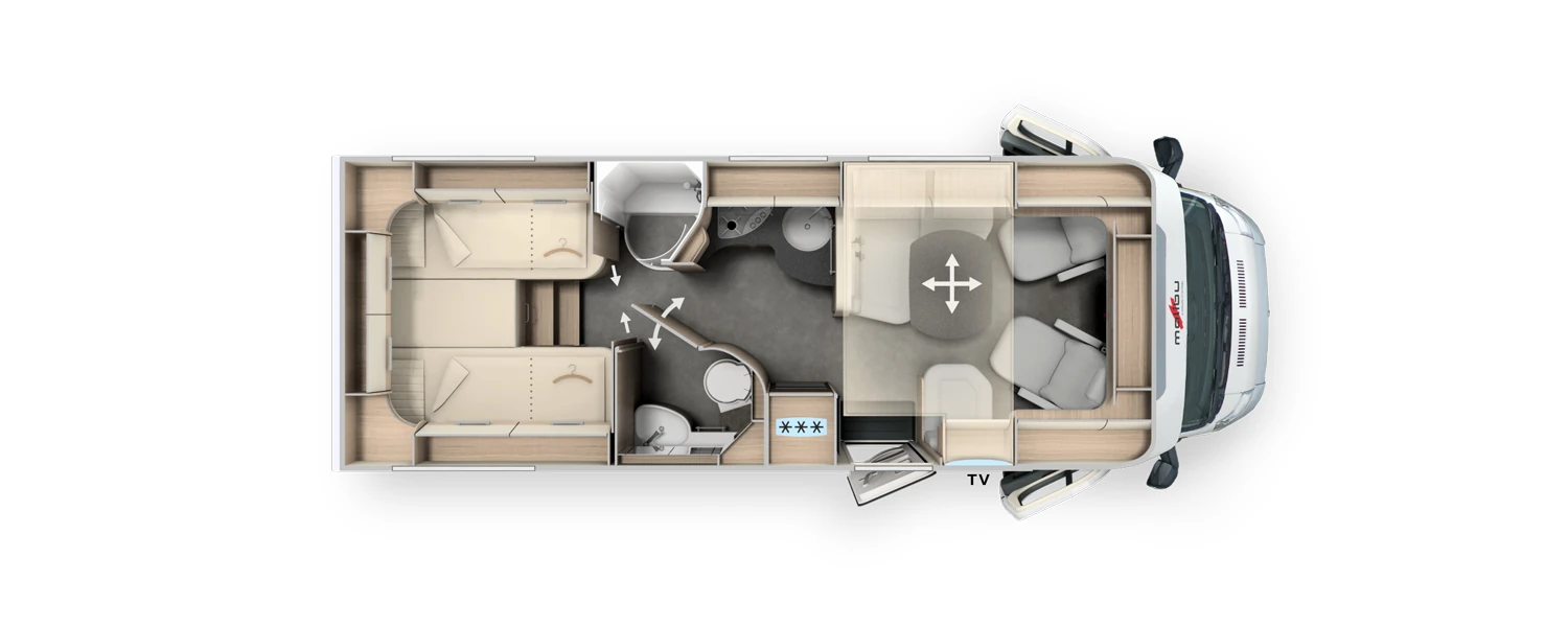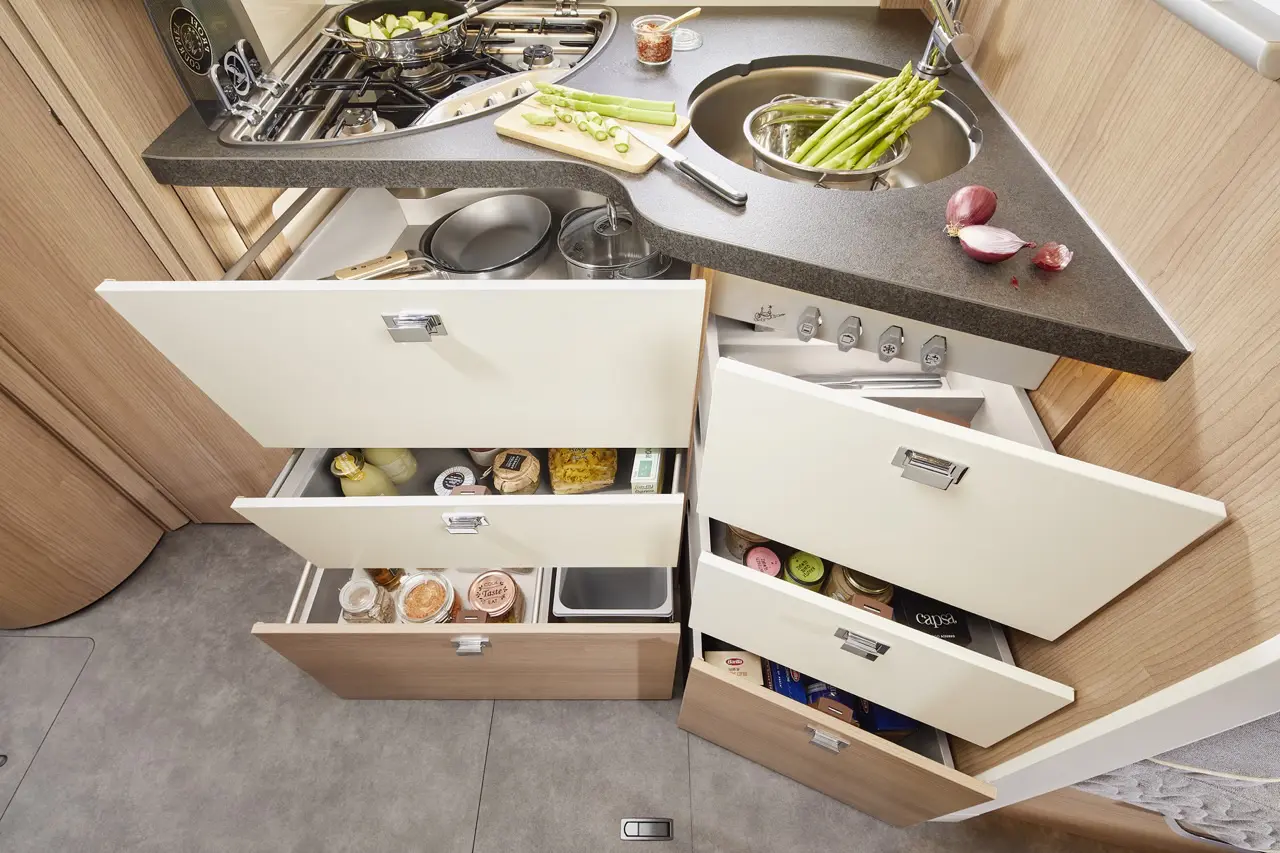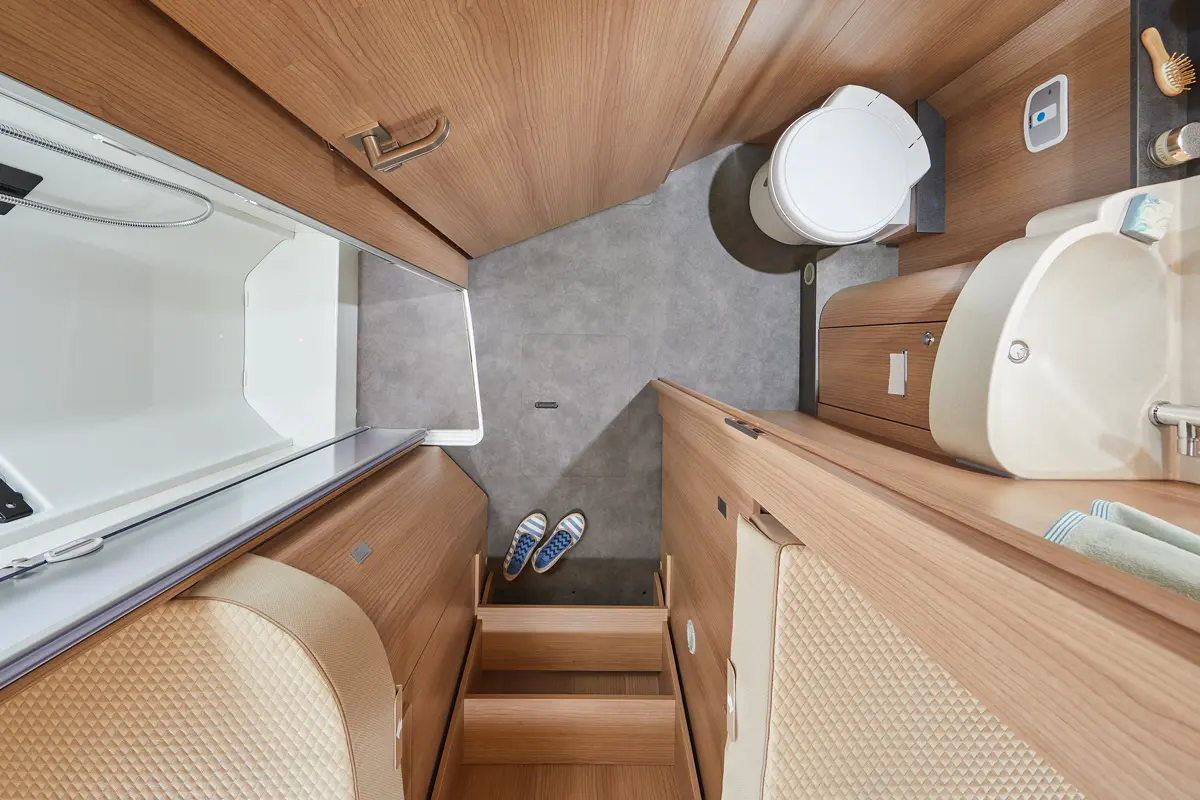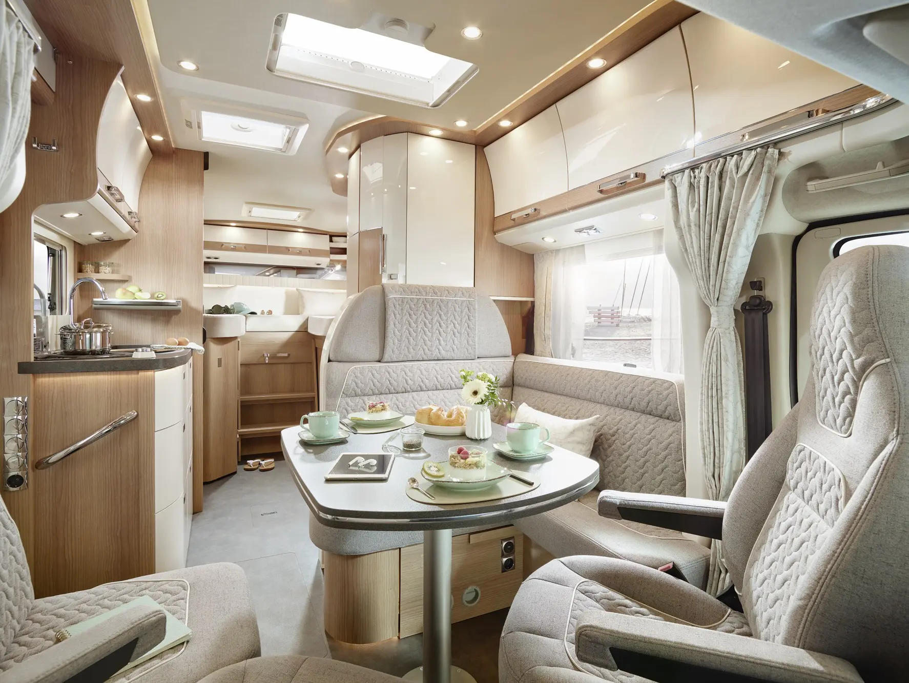 Wohlfühlen wie zuhause: Die L-Wohnsitzgruppe mit ausdrehbarem Schuhschrank und breiter auschwenkbarer Seitensitzbank, die Komfort-Winkelküche, das Komfort-Raumbad mit vollkommen separierbarem Umkleidezimmer und Längseinzelbetten mit großer Liegelänge machen es möglich.