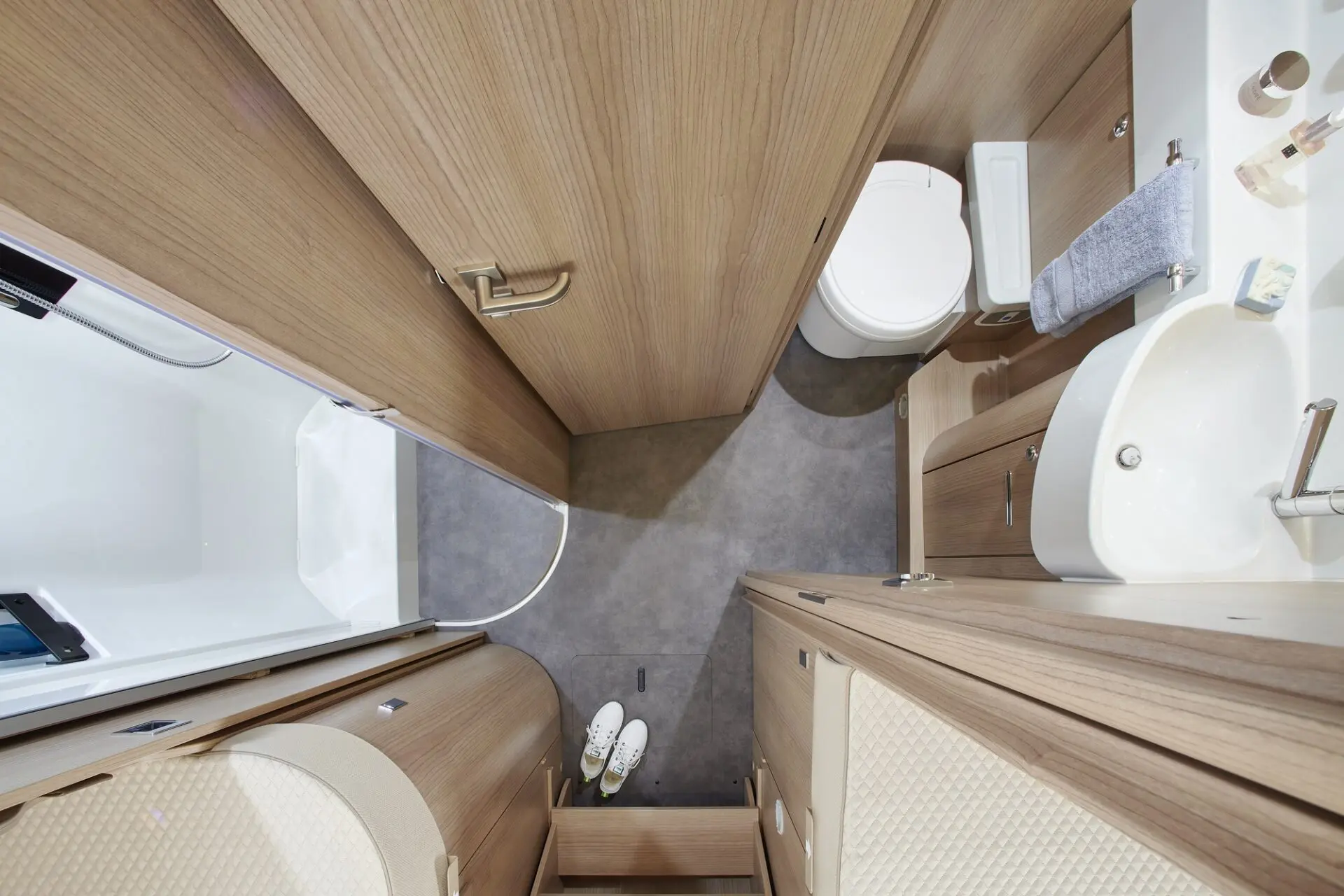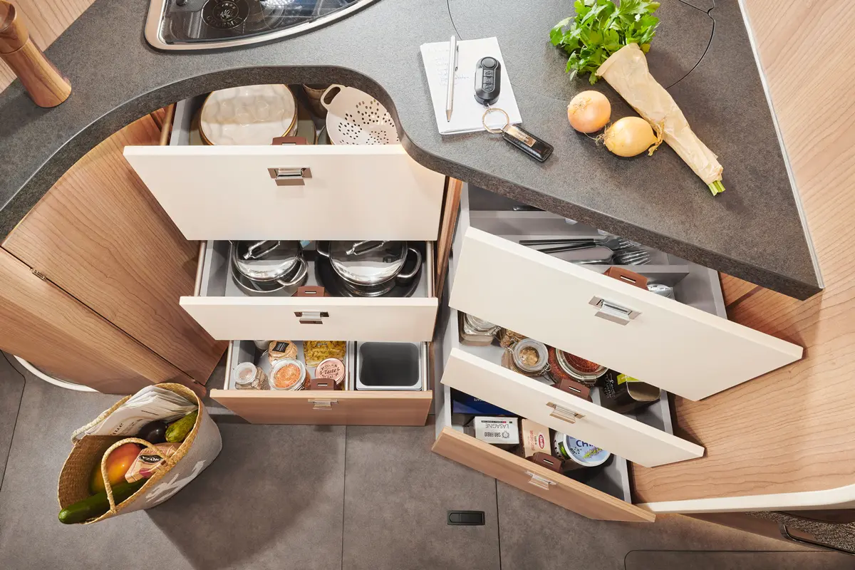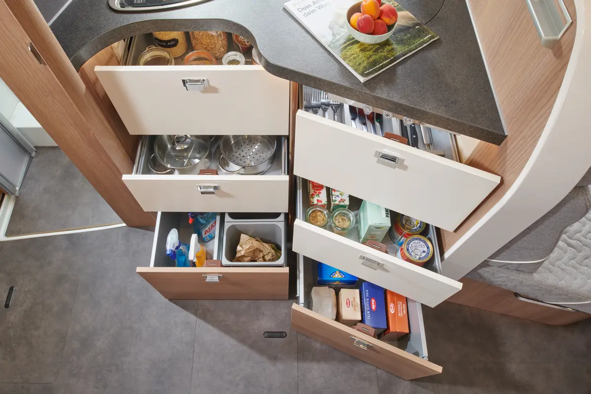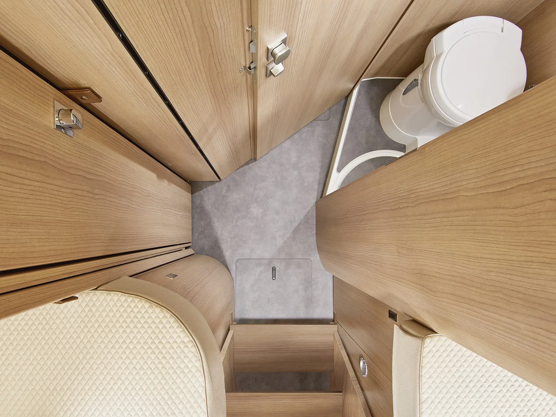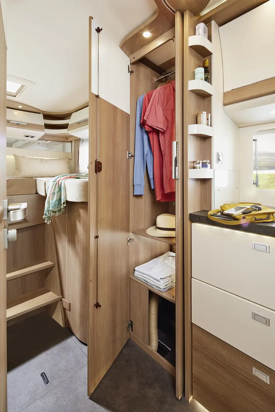 Wohlfühlen wie zuhause: Die L-Wohnsitzgruppe mit ausdrehbarem Schuhschrank und breiter auschwenkbarer Seitensitzbank, die Komfort-Winkelküche, das Komfort-Raumbad mit vollkommen separierbarem Umkleidezimmer und Längseinzelbetten mit großer Liegelänge machen es möglich.