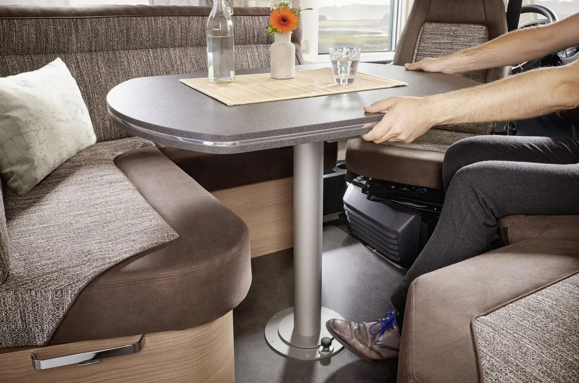 Bequemes Beladen des Doppelboden-Stauraums auf der Beifahrerseite über weitere große Außenklappe. Innenzugang über L-Wohnsitzgruppe, aufschwenkbare (T 490 RB-LE, 500 RB-QB) bzw. aufklappbare Seitensitzbank sowie über große Wohnraumbodenklappe im Eingangs- und Küchenbereich.