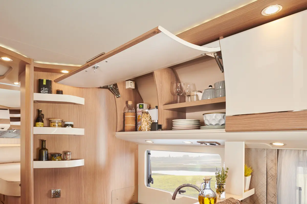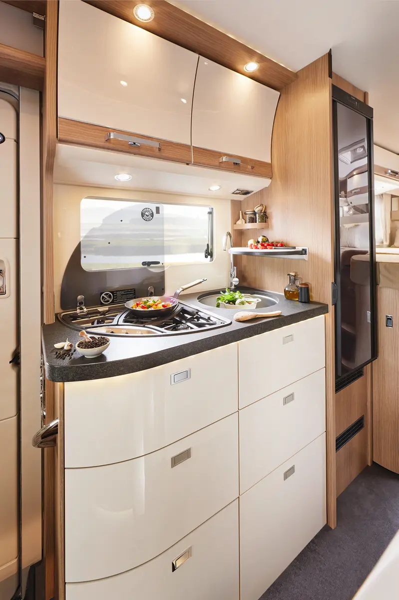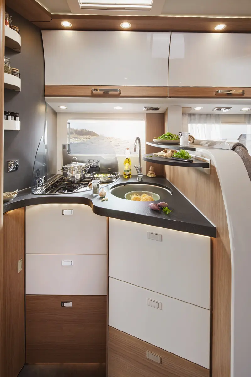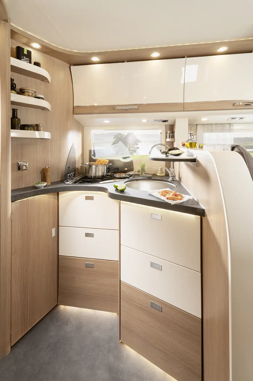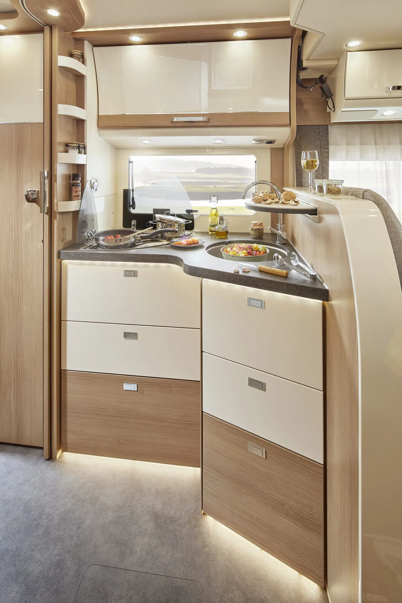 Modern und doch gemütlich – die serienmäßige Stilwelt Bellagio in den teilintegrierten Malibu Wohnmobilen. Die Dachstauschrank-Fronten in Hochglanz Elfenbein mit Holzstreifen und Chromband verleihen dem Fahrzeug den vollen Wohlfühlfaktor. Der PVC-Boden Graphic Stone ergänzt die Möbelfronten perfekt.