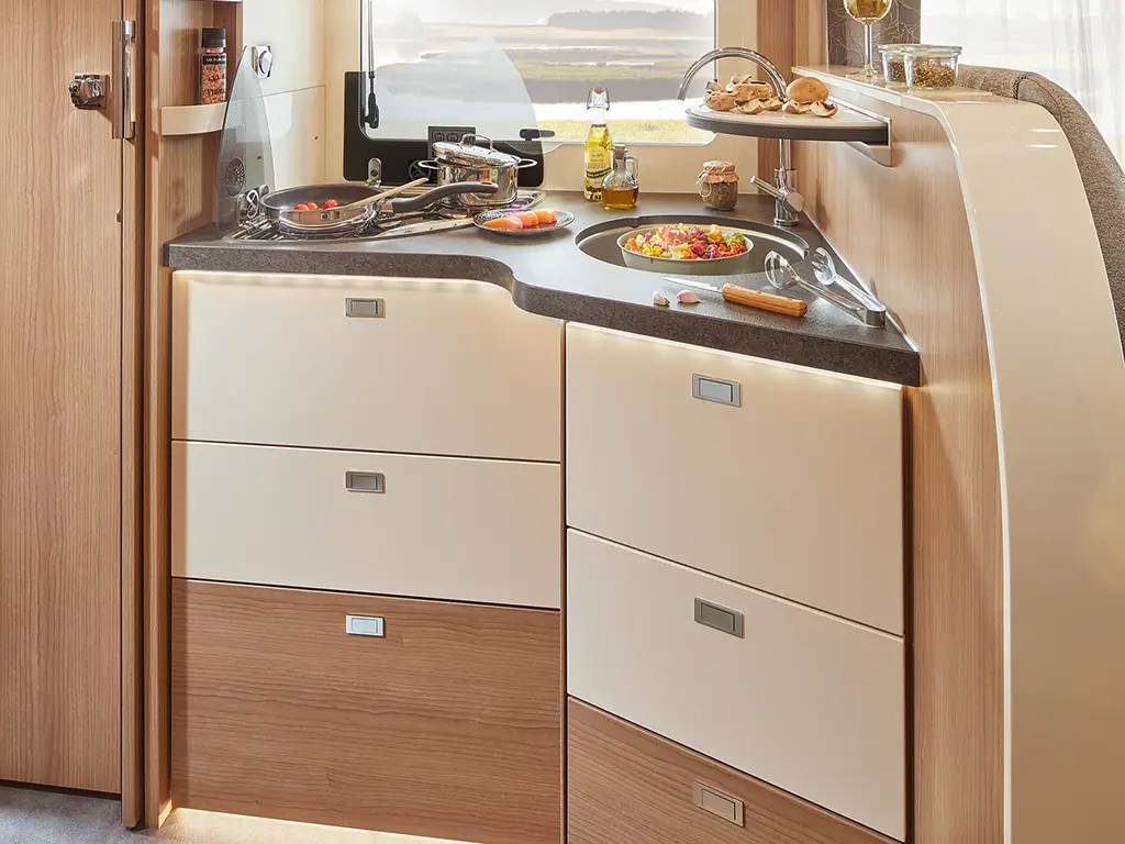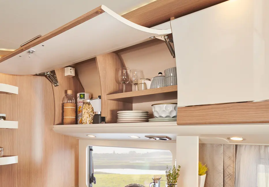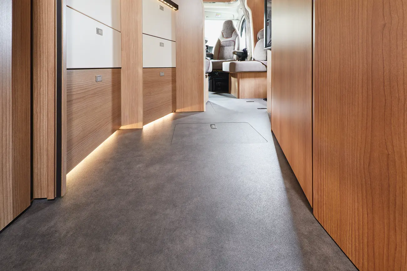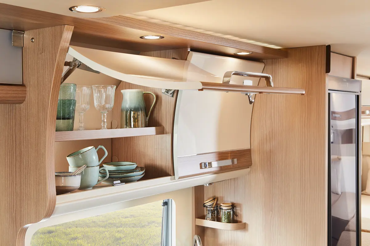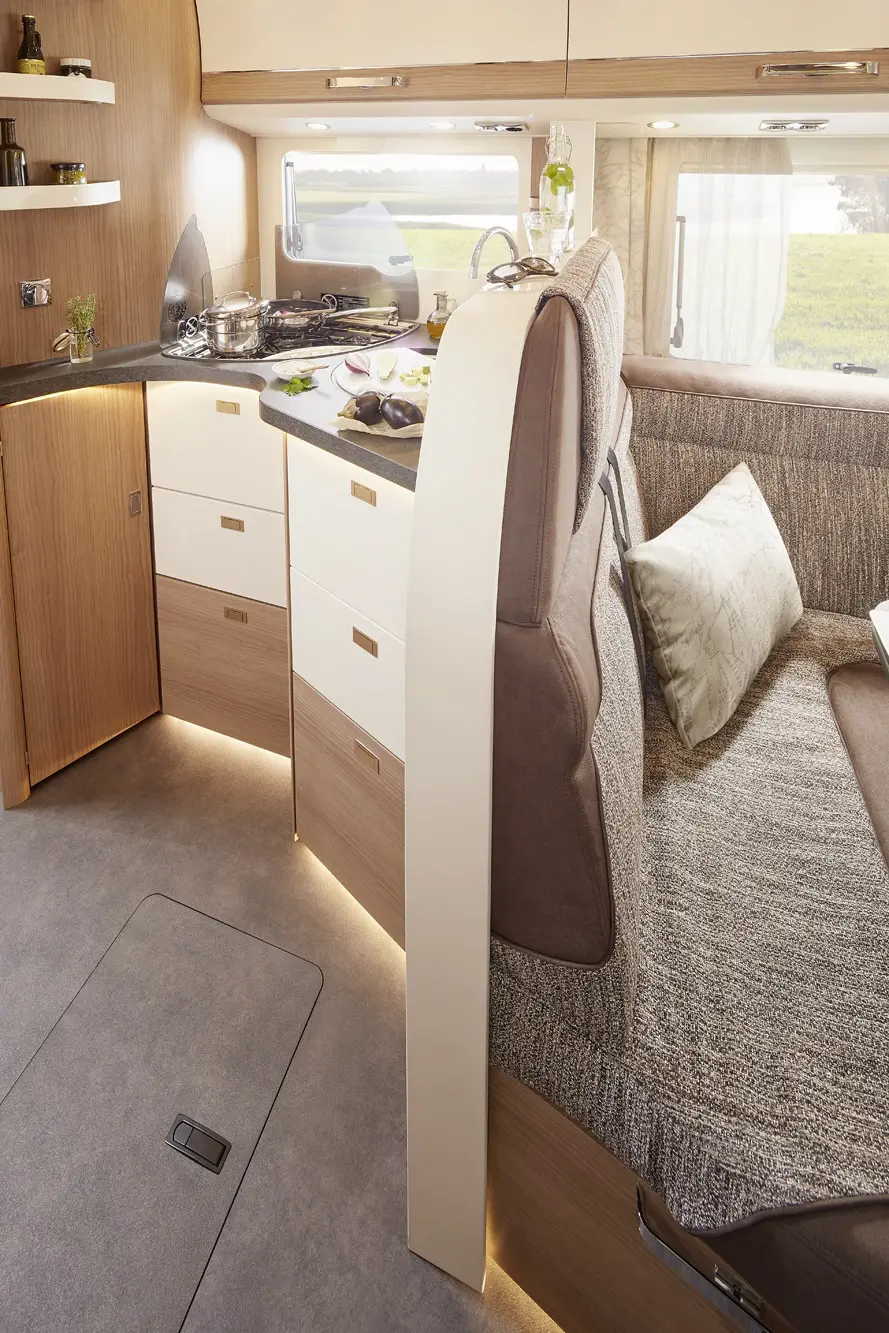 Modern und doch gemütlich – die serienmäßige Stilwelt Bellagio in den teilintegrierten Malibu Wohnmobilen. Die Dachstauschrank-Fronten in Hochglanz Elfenbein mit Holzstreifen und Chromband verleihen dem Fahrzeug den vollen Wohlfühlfaktor. Der PVC-Boden Graphic Stone ergänzt die Möbelfronten perfekt.