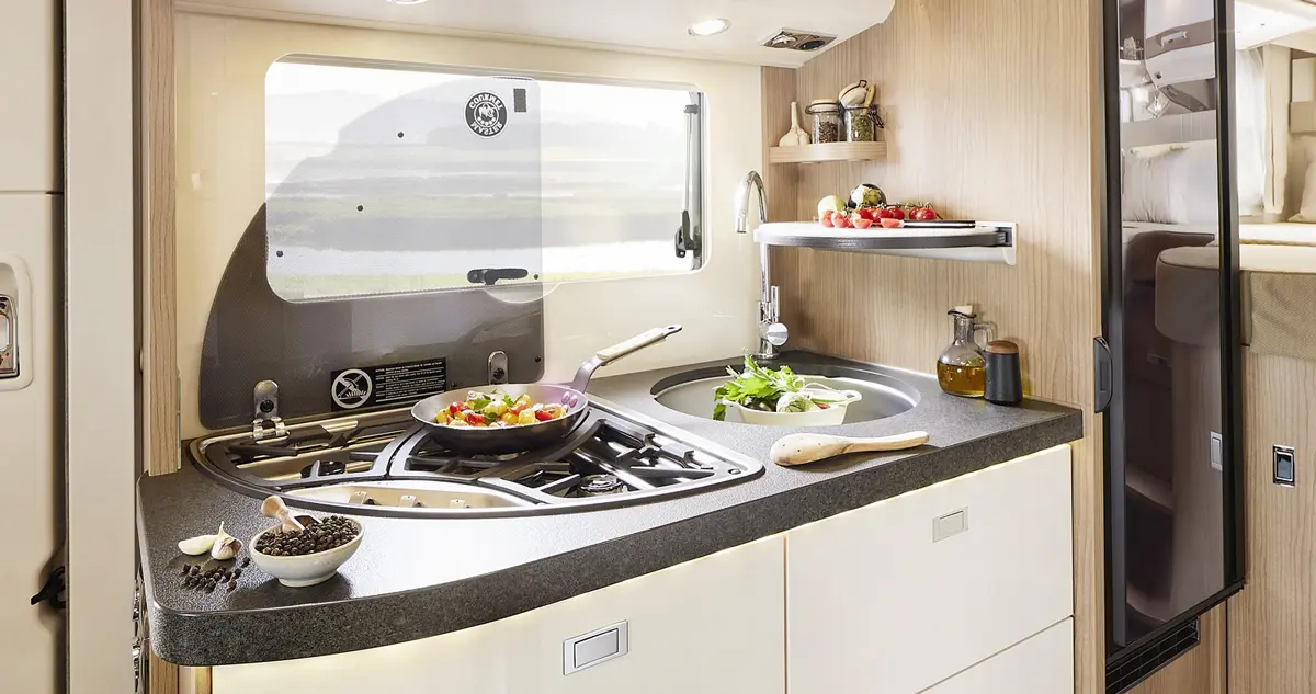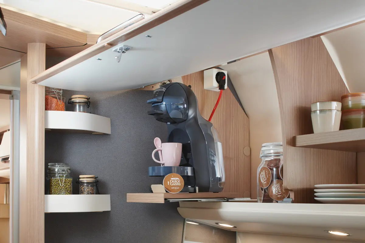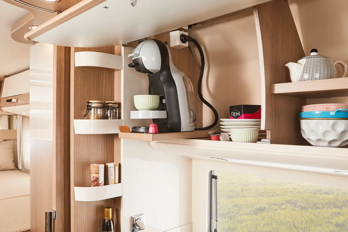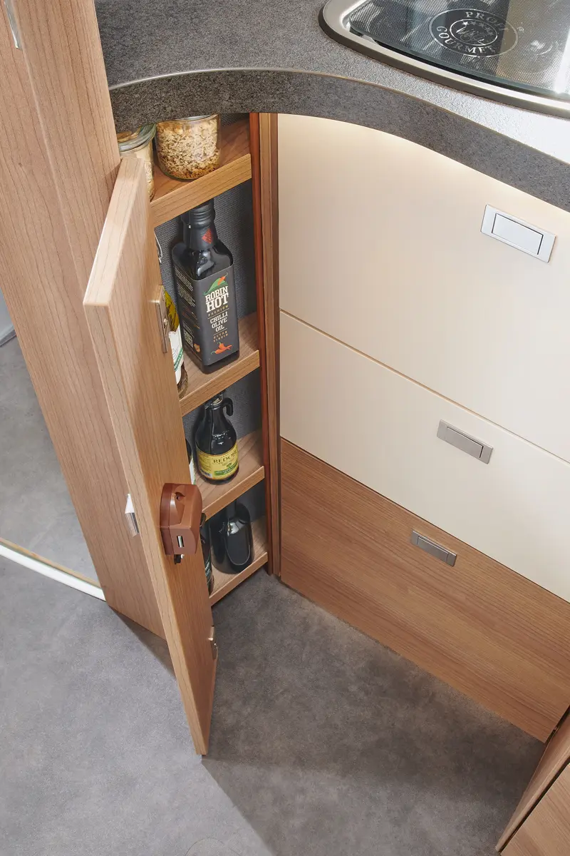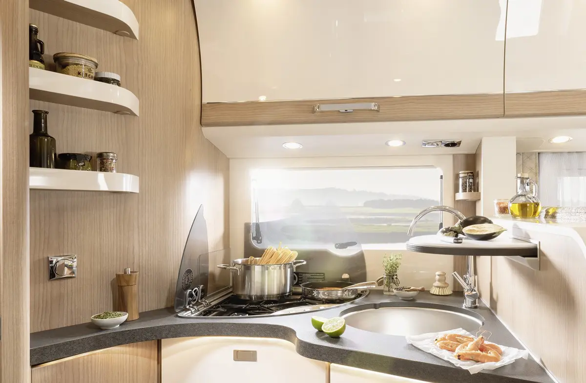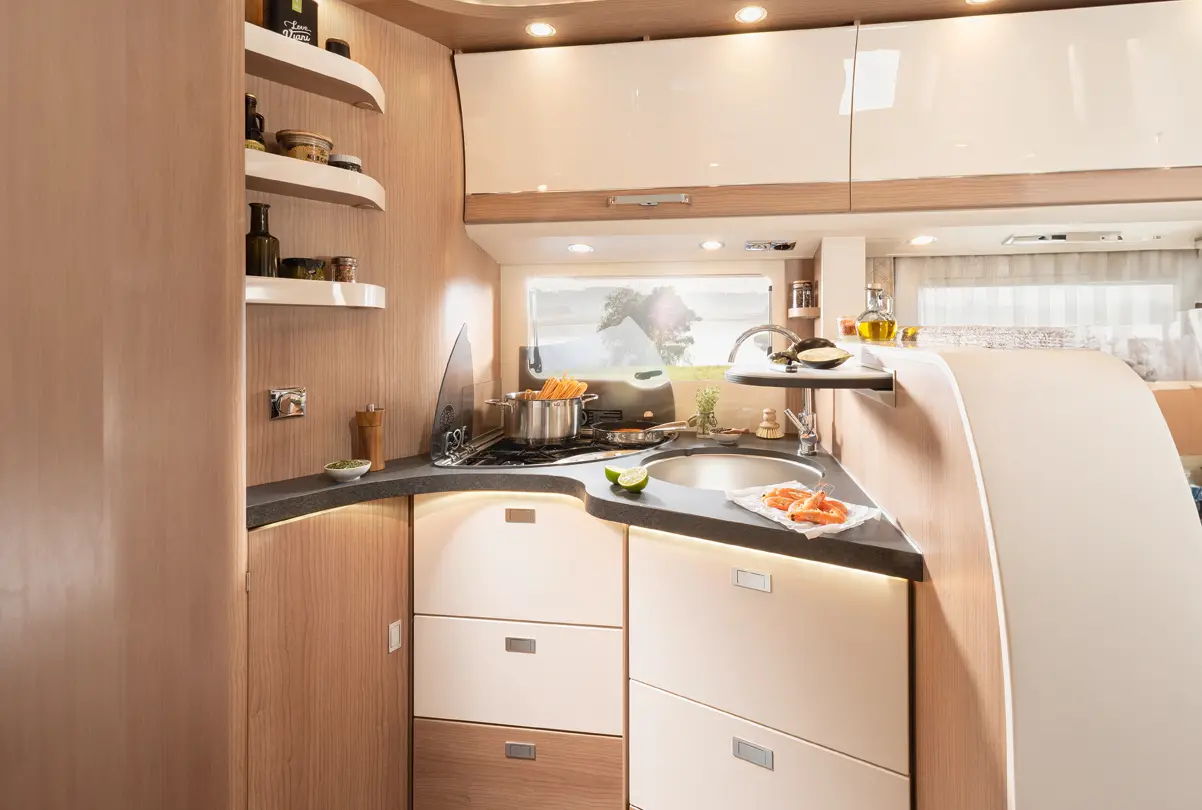 Modern und doch gemütlich – die serienmäßige Stilwelt Bellagio in den teilintegrierten Malibu Wohnmobilen. Die Dachstauschrank-Fronten in Hochglanz Elfenbein mit Holzstreifen und Chromband verleihen dem Fahrzeug den vollen Wohlfühlfaktor. Der PVC-Boden Graphic Stone ergänzt die Möbelfronten perfekt.