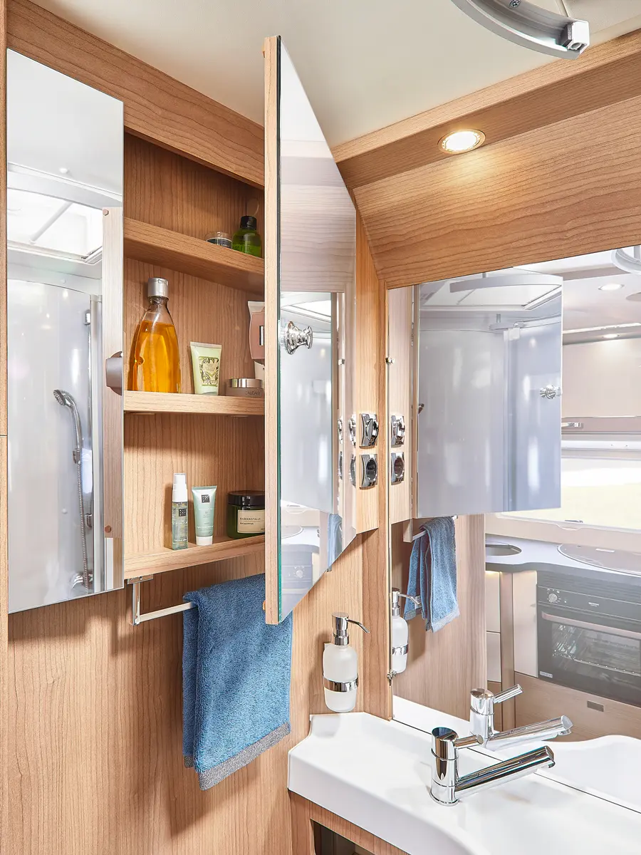 Großzügiger Waschraum mit modernem Aufsatzwaschbecken, großem Wandspiegel und zusätzlichem Stauschrank (nur Modell 450 RB-LE)