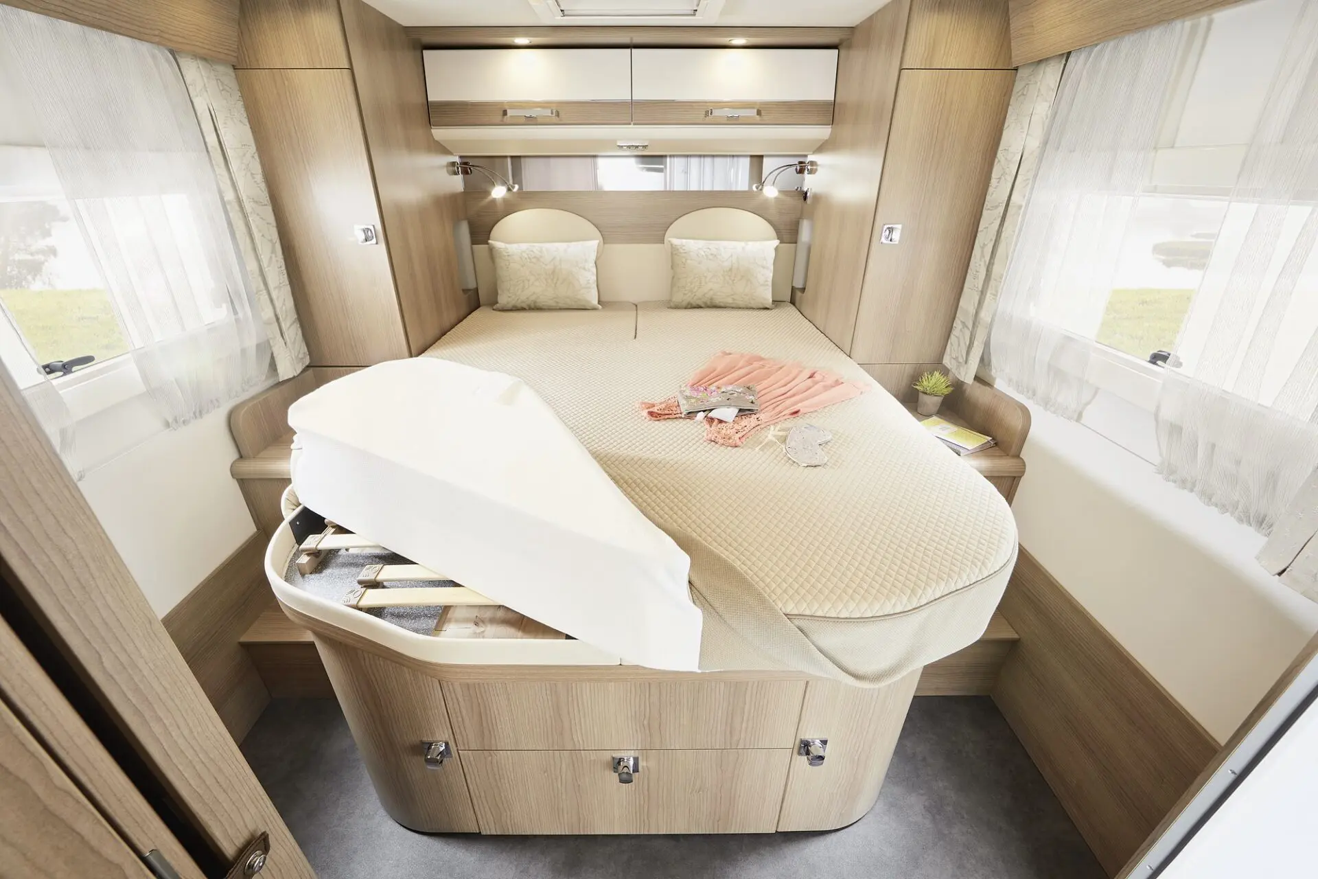 Dachstaukasten seitlich mit Frontklappe unterhalb des Hubbetts auf Fahrer- und Beifahrerseite