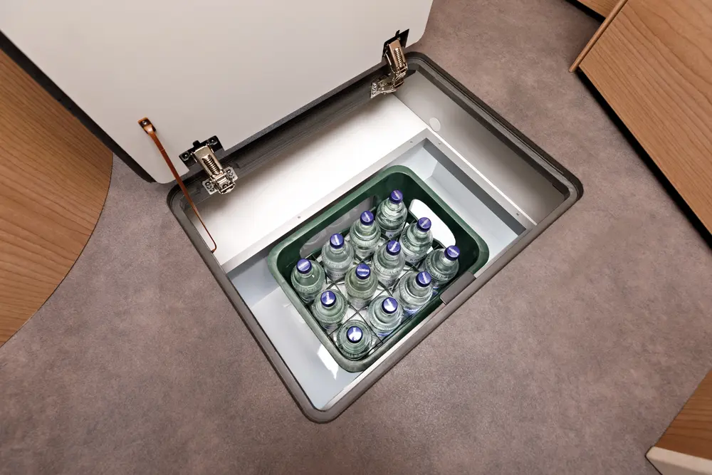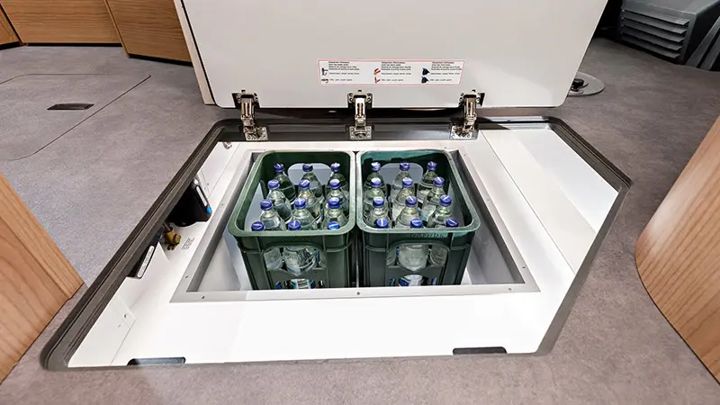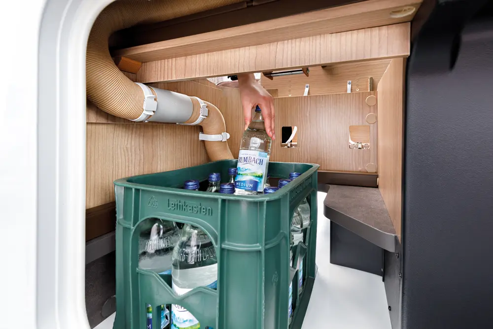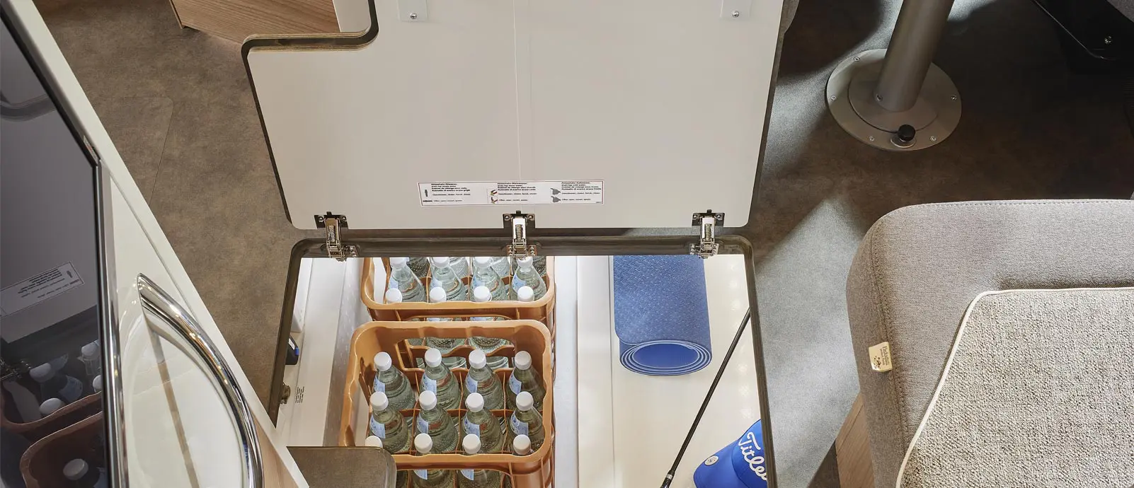 Riesige Wohnraumbodenklappe im Eingangsbereich, bei geöffneter XL-Aufbautür auch bequem von außen beladbar, zweite Wohnraumbodenklappe im Küchenbereich (bis zu 39 cm Nutztiefe)