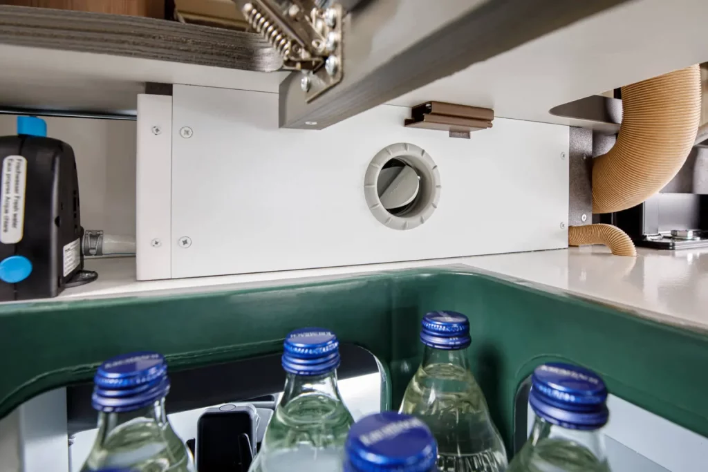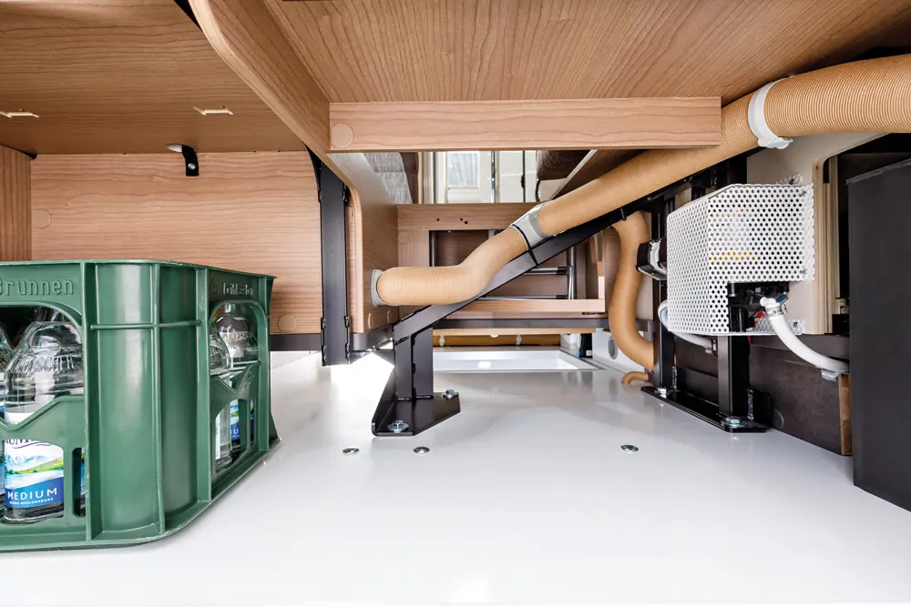 Wasserablasszentrale und Wassertanks im frostsicheren Doppelboden-Keller, auch von außen durch die XL-Aufbautür bedienbar