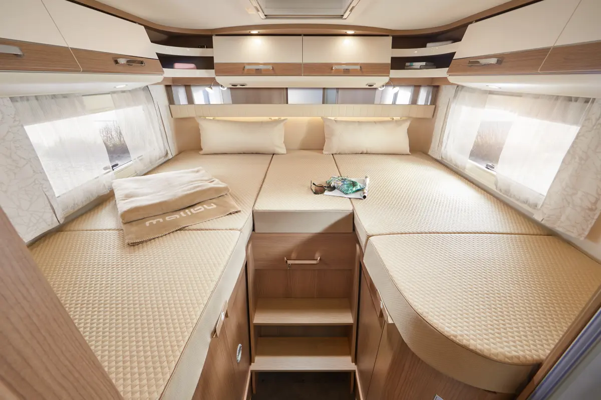 Der Malibu T 500 RB-QB bietet eine L-Wohnsitzgruppe mit ausdrehbarem Schuhschrank und breiter aufschwenkbarer Seitensitzbank, eine Komfort-Winkelküche und ein Komfort-Raumbad mit vollkommen separierbarem Umkleidezimmer für Ihre schönsten Reisen. Obendrauf gibt es das gemütliche Queensbett mit großer Liegefläche.