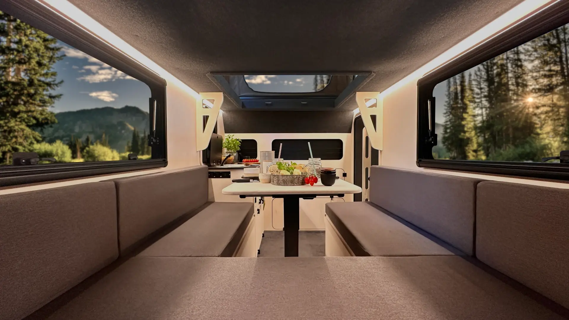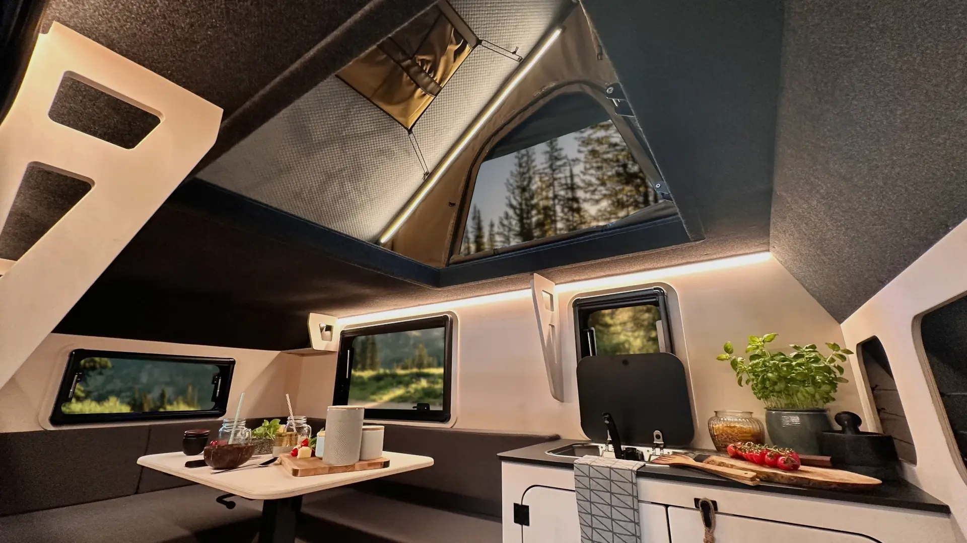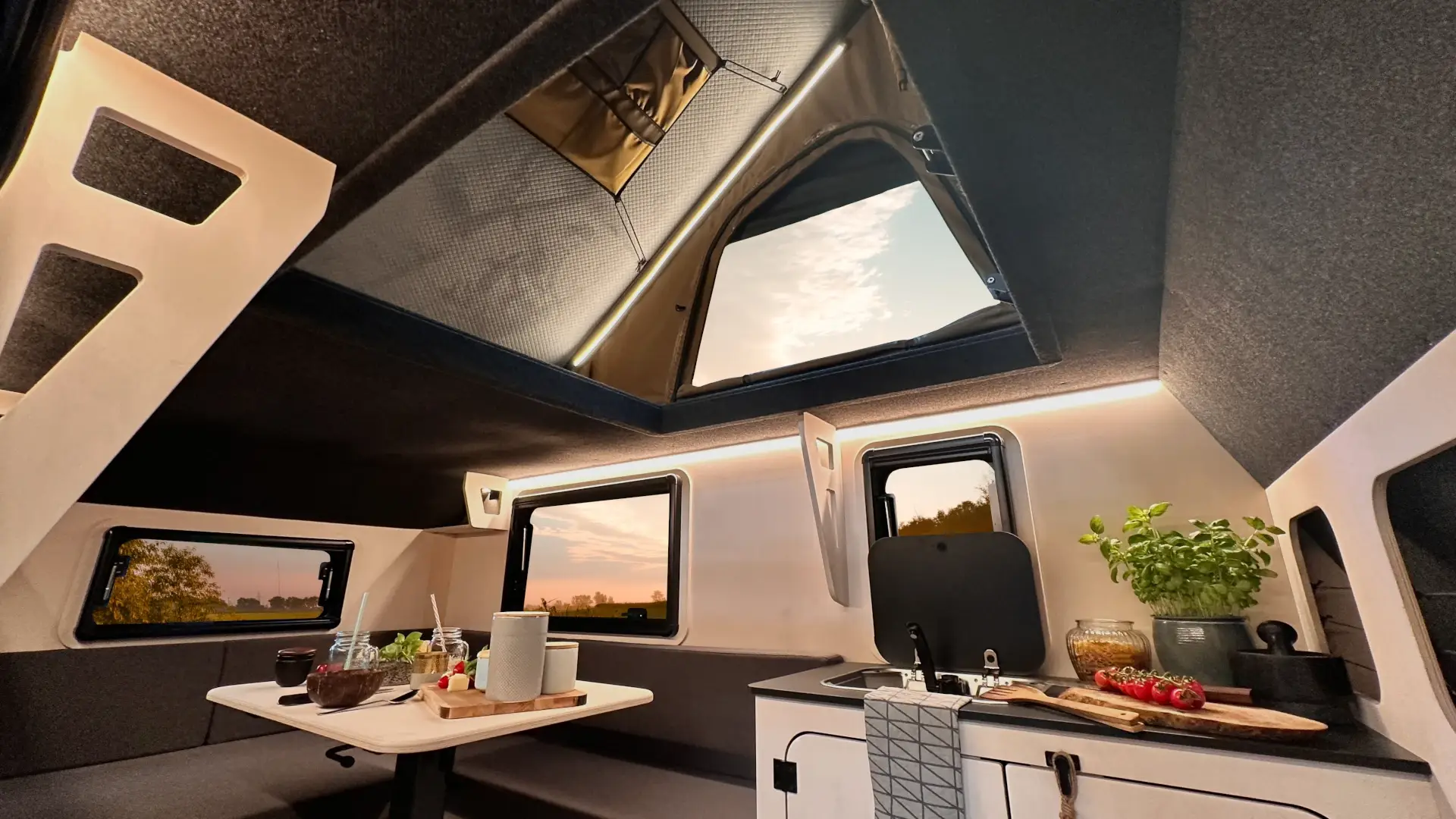 Im Gegensatz zum Mini-Wohnwagen Modell M22 und dem kompakten Wohnwagen Modell M24 verfügt das Modell M23 über ein praktisches Aufstelldach. Für maximale Flexibilität ist eine seitlich ausfahrbare Outdoorküche vorhanden, zusätzlich zur fest verbauten Innenküche. So kannst du je nach Wetterlage drinnen oder draußen kochen.