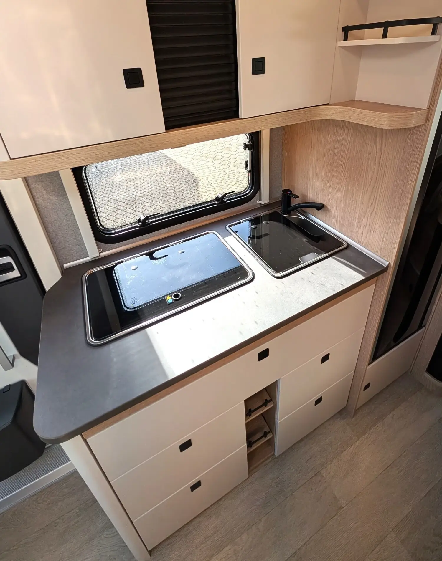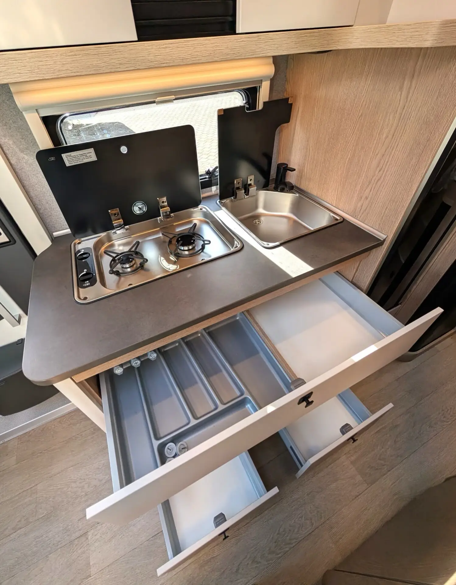 Kühlschrank (AES) DOMETIC, 133 Liter, mit Doppelanschlag, Absorbertechnik, Kocher aus Edelstahl mit 2-Flammen, elektrischer Zündung und Glasabdeckung, Spüle aus Edelstahl mit Glasabdeckung, Arbeitsplattenerweiterung, Besteckeinsatz, Gewürzborde, Küche mit Schubladen in Komfortgröße mit Vollauszug und Soft-Close, Küchensteckdose