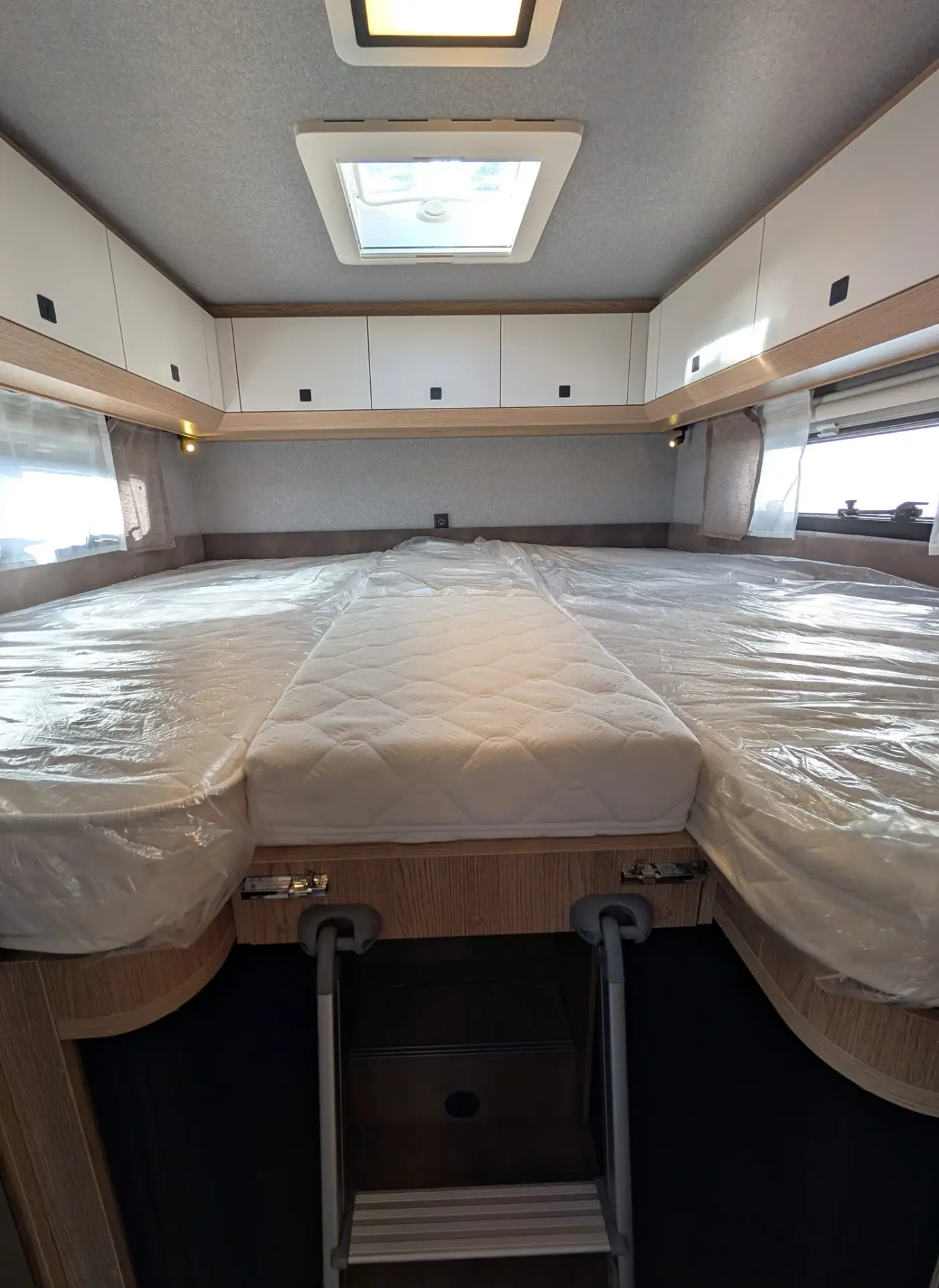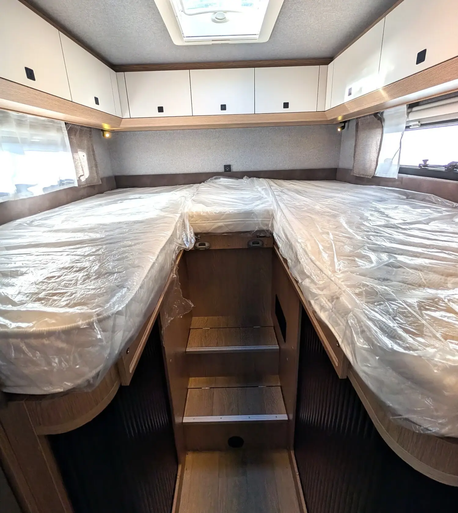 Rahmenfenster, ausstellbar, doppelt verglast und getönt, Rahmenfenster, ausstellbar, doppelt verglast und getönt, auf der Fahrerseite im Schlafbereich, Rahmenfenster, ausstellbar, doppelt verglast und getönt, auf der Beifahrerseite im Schlafbereich, Kombikassetten mit Verdunkelungs- und Insektenschutzrollo, für alle Fenster