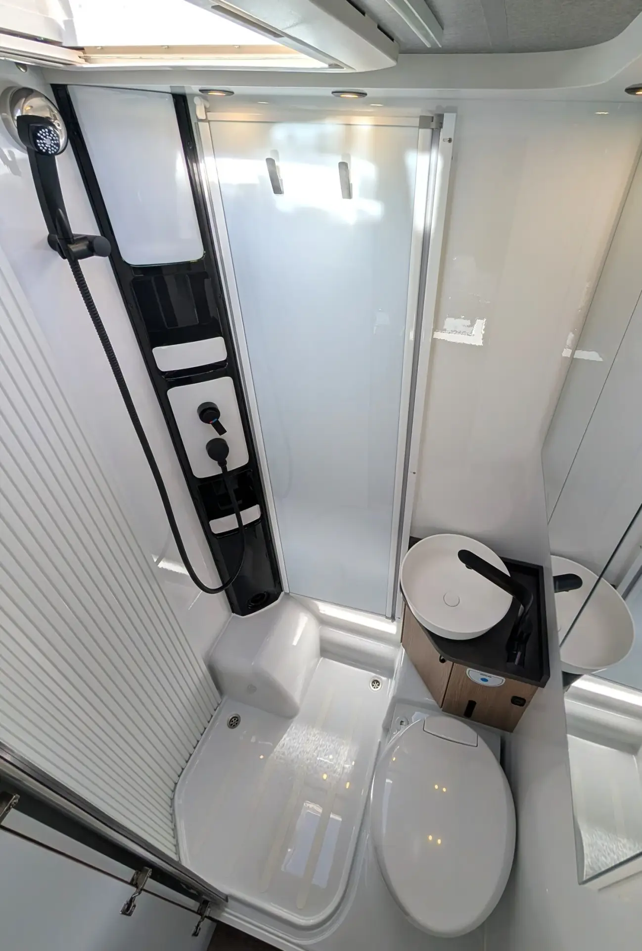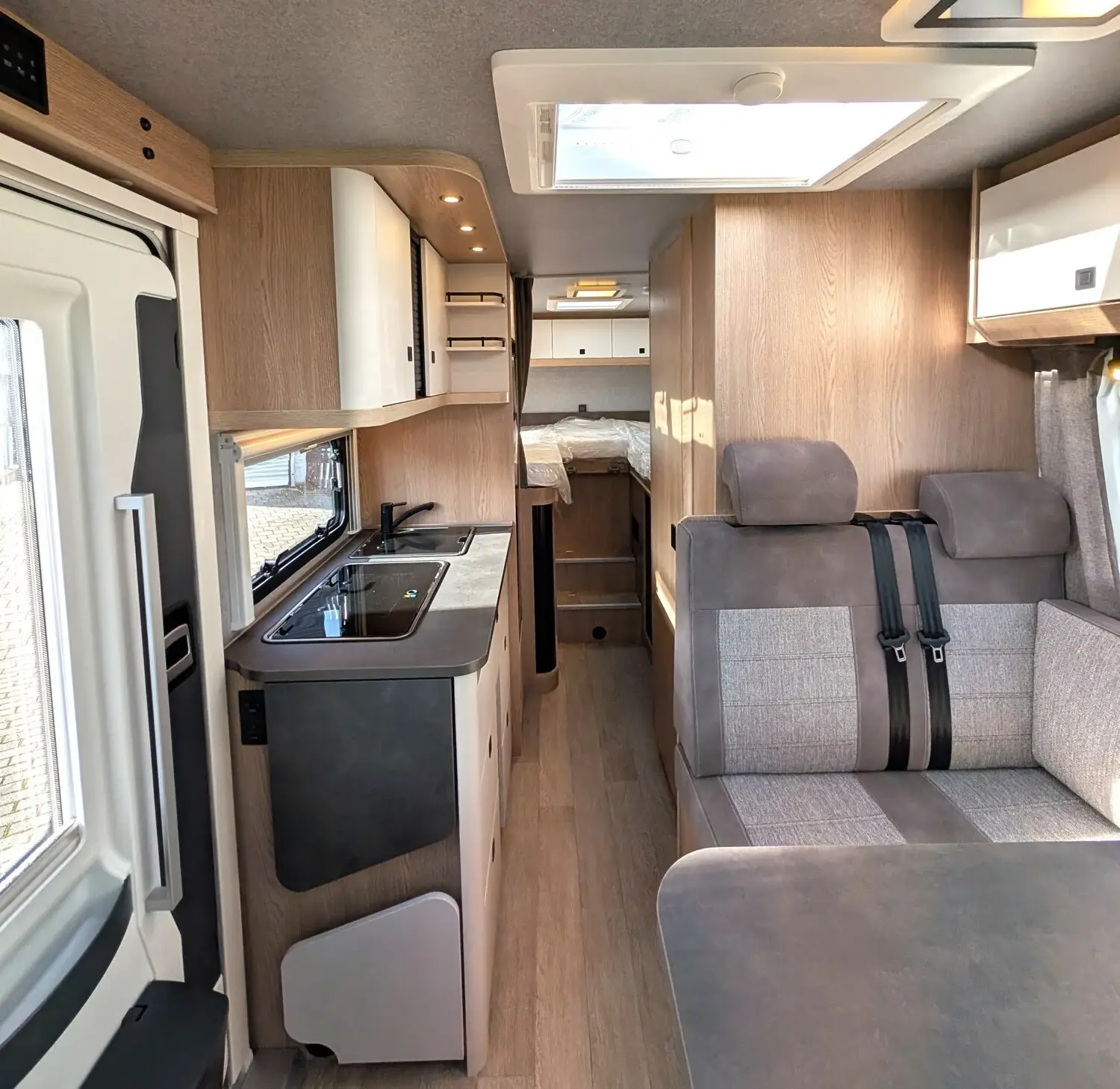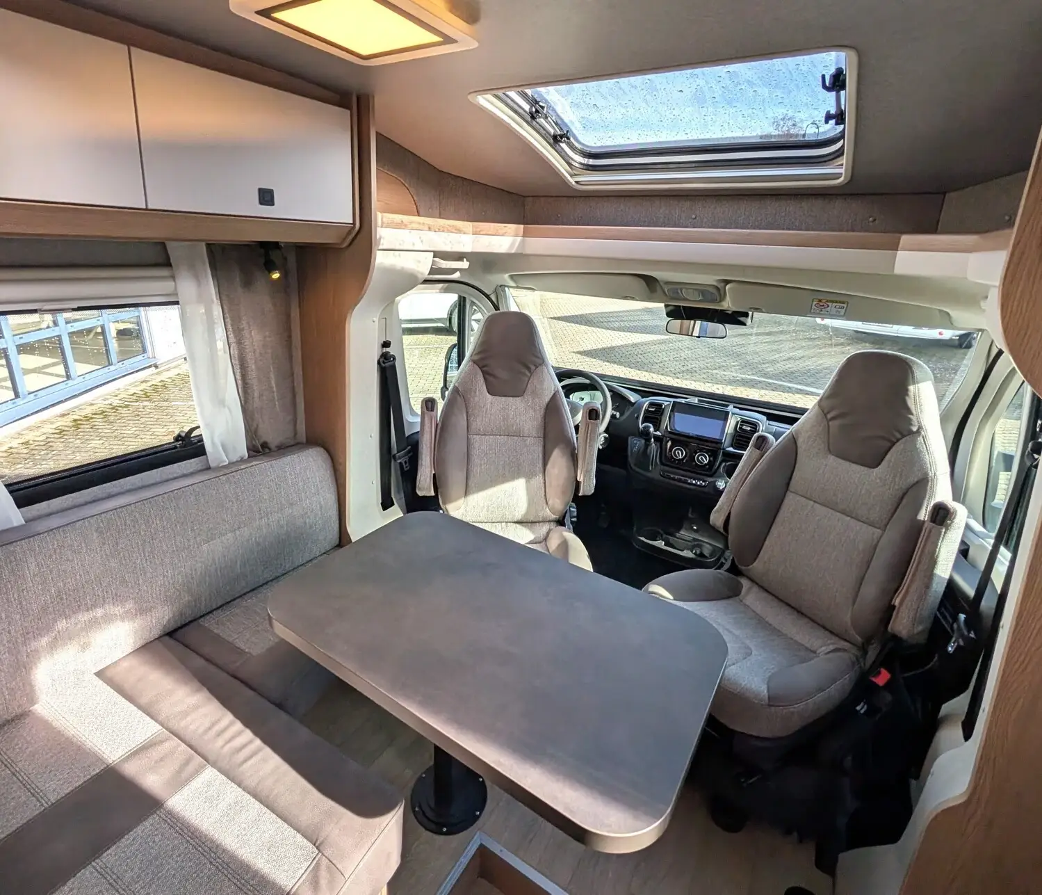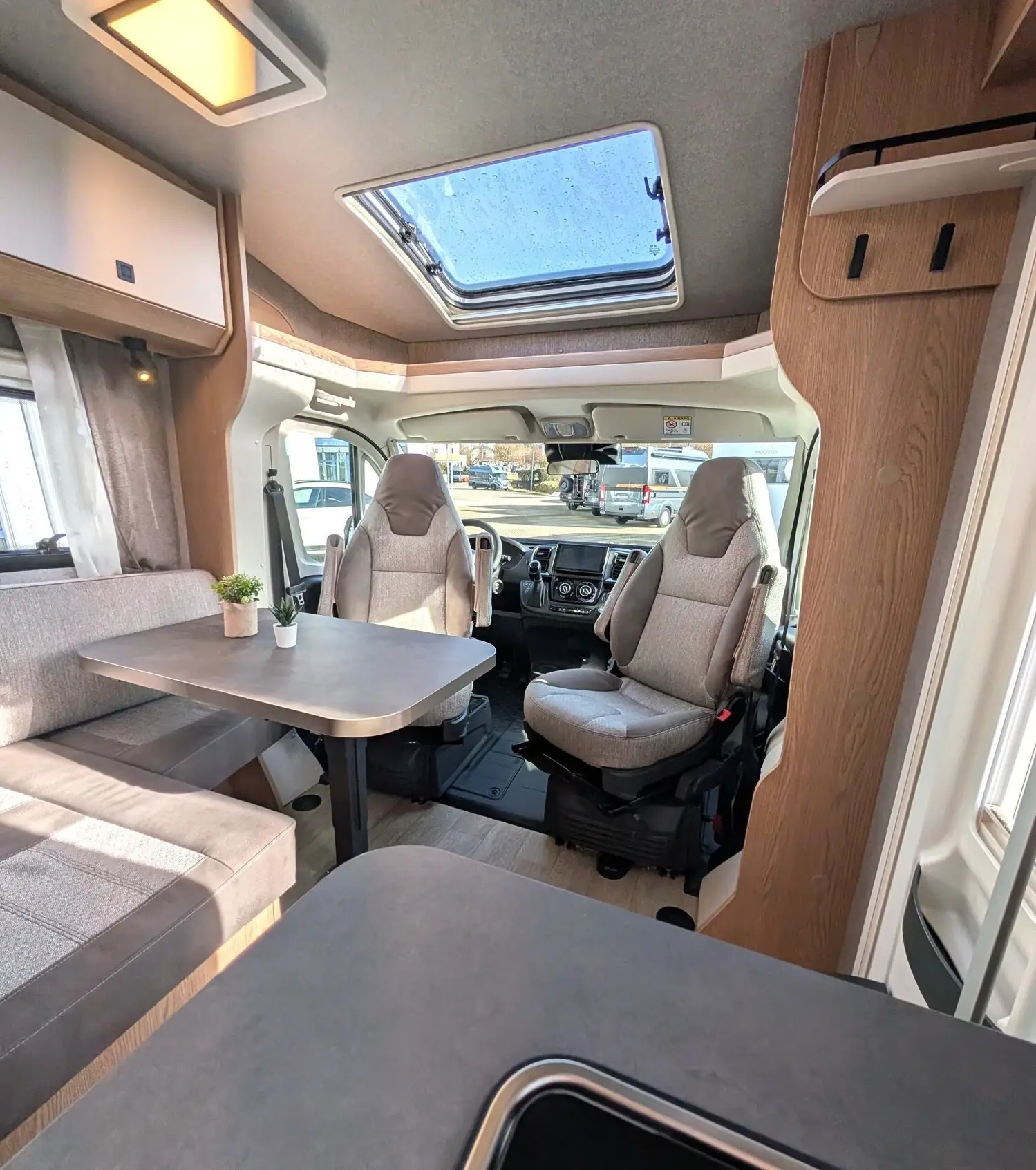 Cupholder, Dachfenster, ausstellbar, doppelt verglast und getönt, Fahrer- und Beifahrersitz drehbar, Fahrer- und Beifahrersitz mit Wohnraumstoff bezogen, Fahrer- und Beifahrersitz mit Armlehnen ?Captain´s Chair? mit Lordosenstütze, höhenverstellbar, Umlaufendes Regalbord, USB-Ladesteckdose (USB-A / USB-C), Verdunkelungssystem DOMETIC für Front- und Seitenscheiben im Fahrerhaus