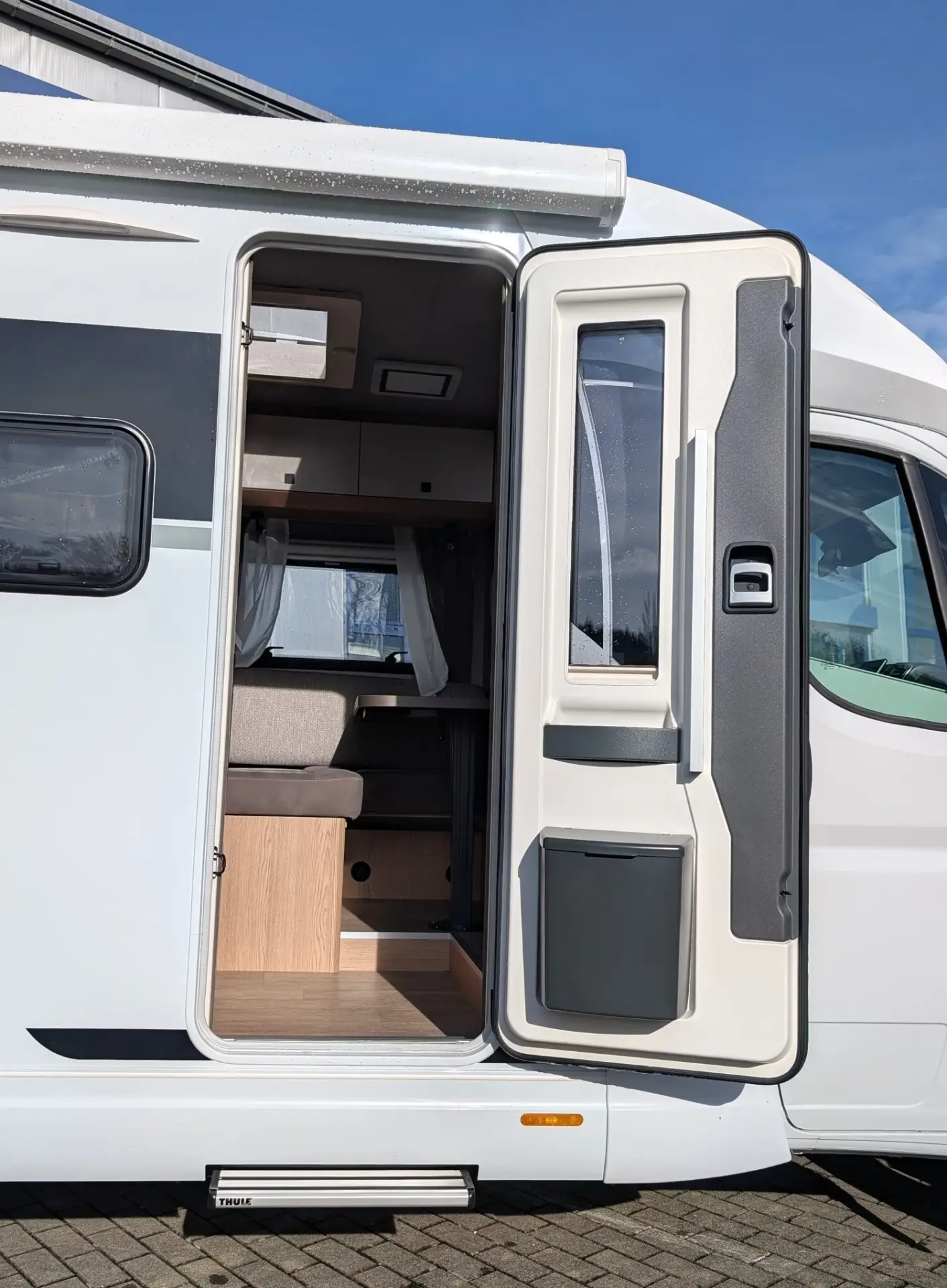Anbaumarkise THULE OMNISTOR, Breite 400 cm, Ausfahrtiefe 250 cm, Dachhaube DOMETIC SEITZ, Mini-Heki 400 x 400 mm, mit Verdunkelungs- und Insektenschutzplissee im Schlafbereich, Dachhaube DOMETIC SEITZ, Mini-Heki 400 x 400 mm, mit Verdunkelungs- und Insektenschutzplissee im Waschraum, Dachhaube DOMETIC SEITZ, Midi-Heki 700 x 500 mm, mit Verdunkelungs- und Insektenschutzplissee im Wohnraum, Eingangstür, extrabreit mit Doppelverriegelung, Fenster, Abfalleimer und Staufächern, lichtes Maß: 605 x 1.740 mm, Einstiegsstufe, elektrisch ausfahrbar, Gasflaschenauszug, passend für 2 x 11-kg-Flaschen, GFK-Boden mit XPS-Wärmedämmung, GFK-Dach für optimalen Hagelschutz, Heckverstärkung für Fahrradträger, Insektenschutz für Eingangstür, LED-Einstiegsleuchte, Schürzenleisten aus Aluminium, Winterbelüftung für Sitzgruppe, Stauschränke und Betten
